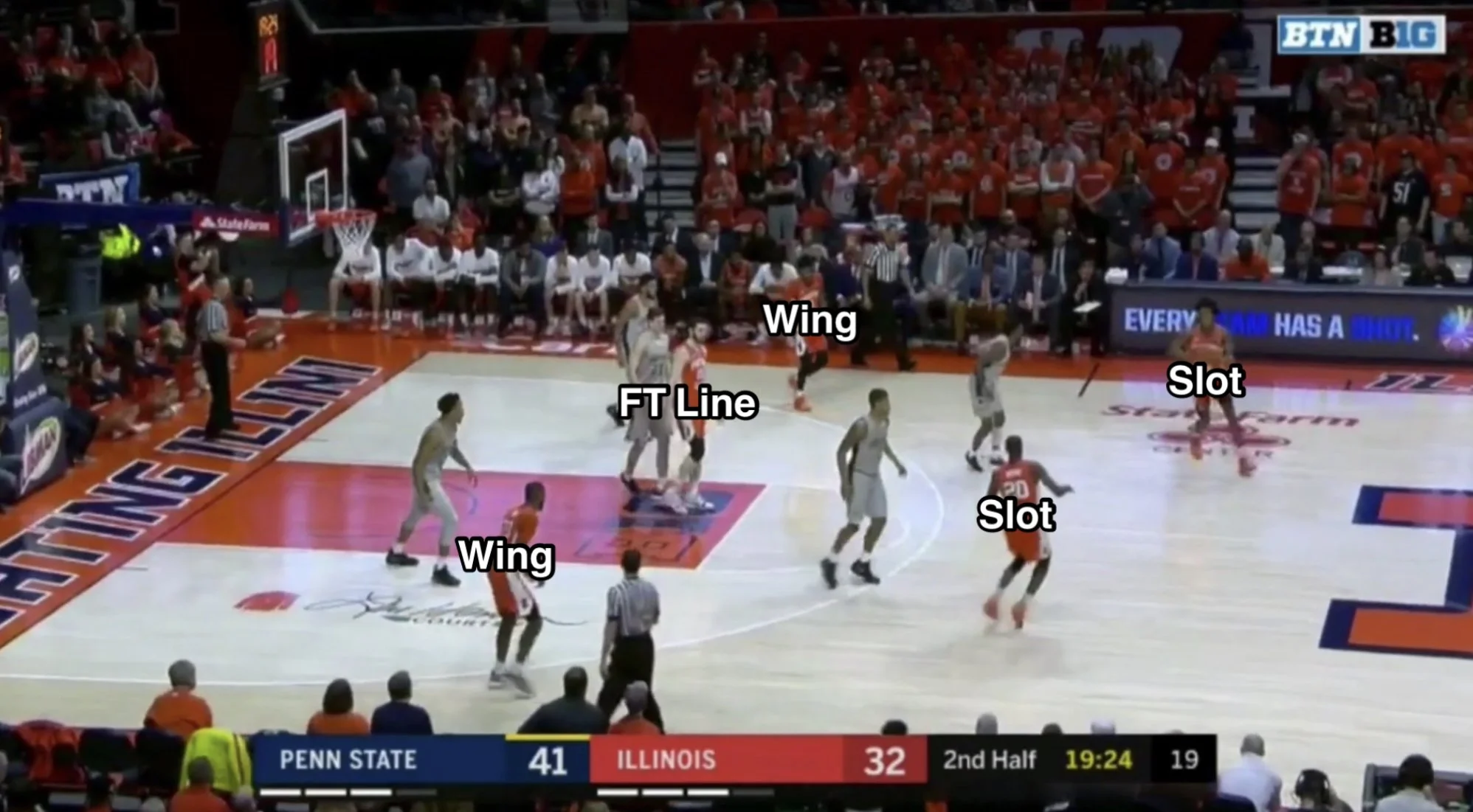 In the spread offense, there are four perimeter positions typically occupied by the 1-4 players, with these positions being interchangeable. The perimeter players filling the slots are a little wider than elbow extended, and the players filling the wings are free throw line extended. The 5-man positions himself in the middle of the free throw line to start.