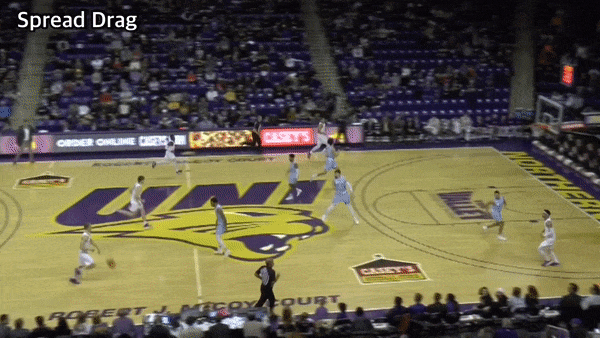 One action that Northern Iowa routinely flows into from transition, especially if their 5-man is trailing the ball handler, is a drag screen. Simply put, drag screens are essentially ball screens set in transition.