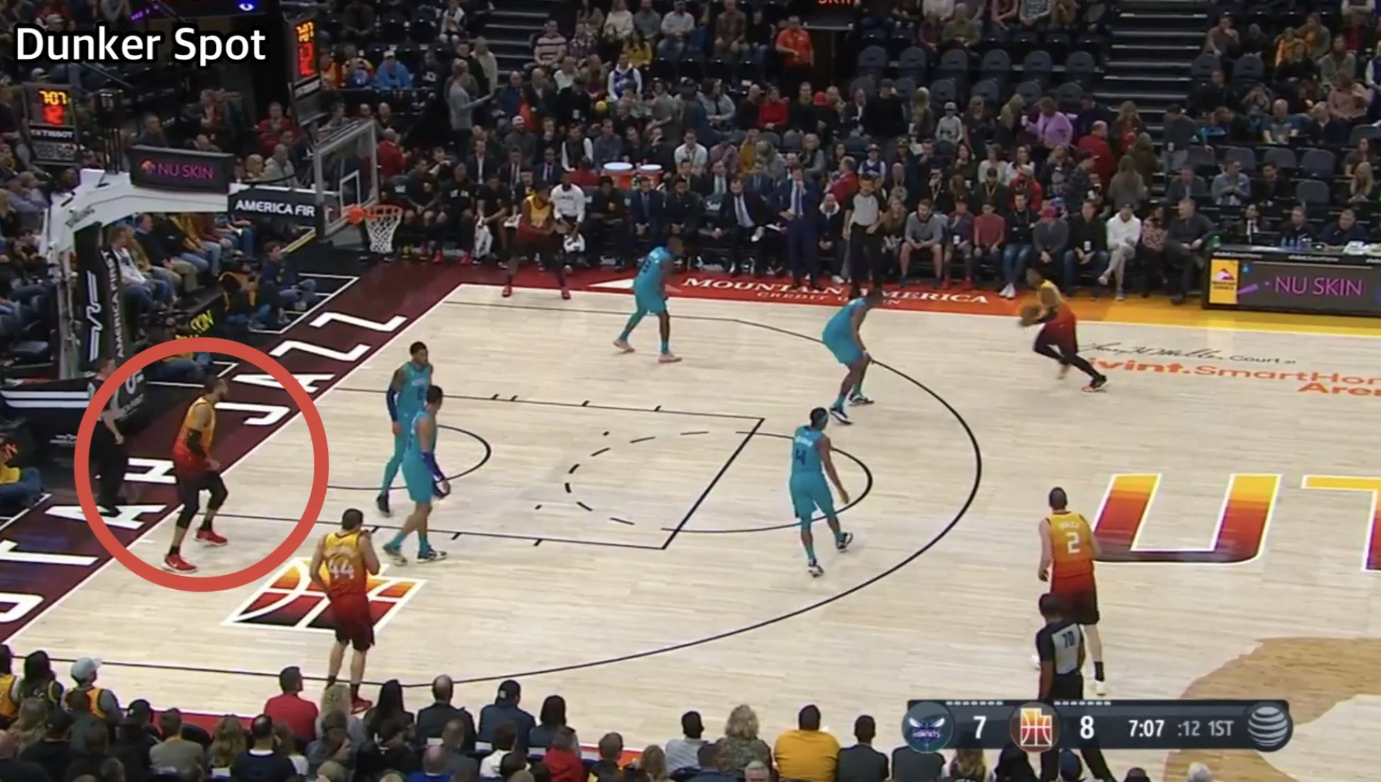 The “dunker” spot is the area along the baseline just outside of the lane, but not quite in the short corner. The dunker spot is typically filled by post players or non-shooters. Utilizing the dunker spot allows you to still play a traditional post player, while also creating as much space as possible for perimeter players to attack off the dribble.
